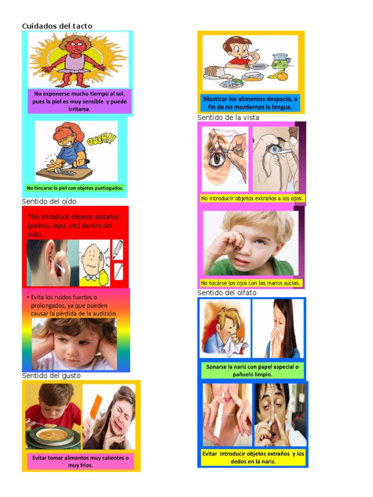 A continuación, se presentarán algunos datos para cuidar los cinco sentidos: Es importante leer con luz clara para no forzar el sentido de la vista. Es necesario proteger a los ojos de las partículas de polvo que hay en el ambiente y de los rayos solares. Es importante siempre tener las manos limpias para evitar la evolución de los.