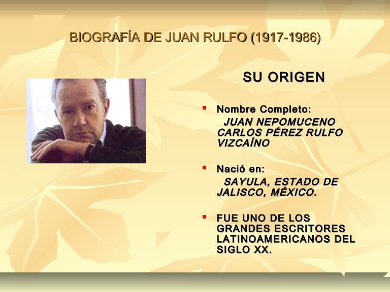 Biografía y obra de Juan Rulfo. Autor mexicano de "Pedro Páramo". Juan Rulfo nació el 16 Mayo de 1917 en el estado mexicano de Jalisco. Su nombre completo fue Juan Nepomuceno Carlos Pérez Rulfo Vizcaíno. Tuvo una infancia triste y dura. Quedó huérfano de padre a los 6 años y luego perdió a su mamá a los 10.