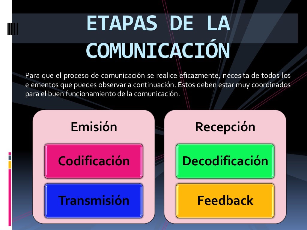 Fases del proceso comunicativo. Las fases del proceso comunicativo son las siguientes: Desarrollo de la idea que se desea transmitir. Codificación del mensaje eligiendo el tipo de lenguaje que se va a utilizar por parte del emisor y el receptor. Transmisión de mensajes, incluyendo el lenguaje, el formato y el código que ha sido seleccionado.