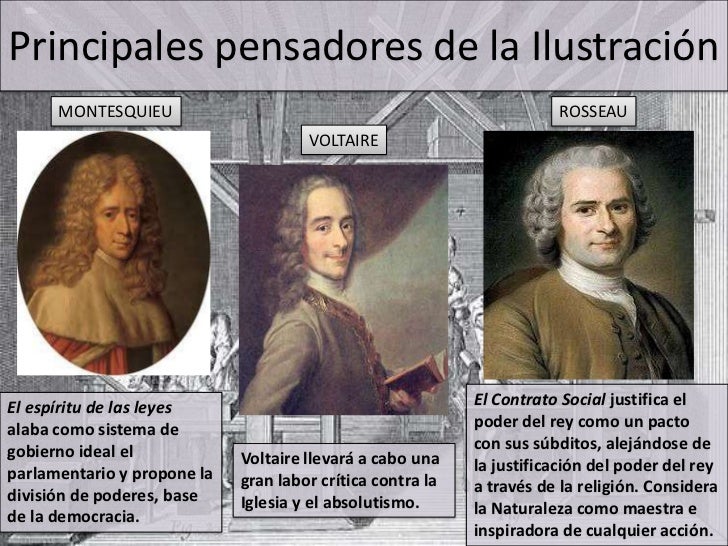 Entre los principales pensadores de la ilustración se encuentran: Voltaire. Montesquieu. Rousseau. Diderot. Adam Smith. Estos pensadores defendieron la libertad, la igualdad, la tolerancia, la separación de poderes y el progreso, entre otros valores que fueron fundamentales para la construcción de la sociedad moderna.