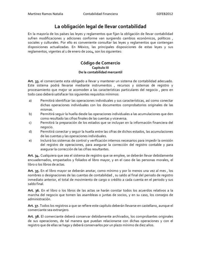 Leyes y reglamentos que obligan a llevar contabilidad en México. por Yunuen Lr 1. Bibliografías Fernanda Casiano (Septiembre 19, 2011) Contabilidad y economía. Fecha de consulta Febrero 08, 2019. 2. CÓDIGO DE COMERCIO 2.1. Título II de las obligaciones comunes a todos los que profesan el comercio. Fracción III, Articulo del 33 al 38.