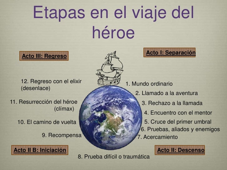 El viaje del Héroe, conocido como monomito, es un esquema narrativo ideado por Joseph Campbell (1904-1987), un profesor y mitólogo estadounidense que presentó este compendio en 1949 en El héroe de las mil caras .Este texto presentaba 17 etapas, pero posteriormente Christopher Vogler (1949-) las dejó en 12 etapas en Viaje del escritor.. Como venimos diciendo, Campbell describe diecisiete.