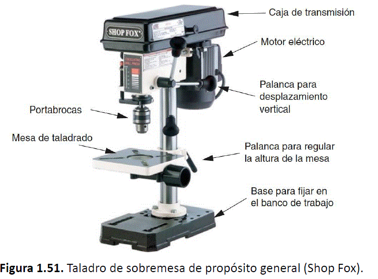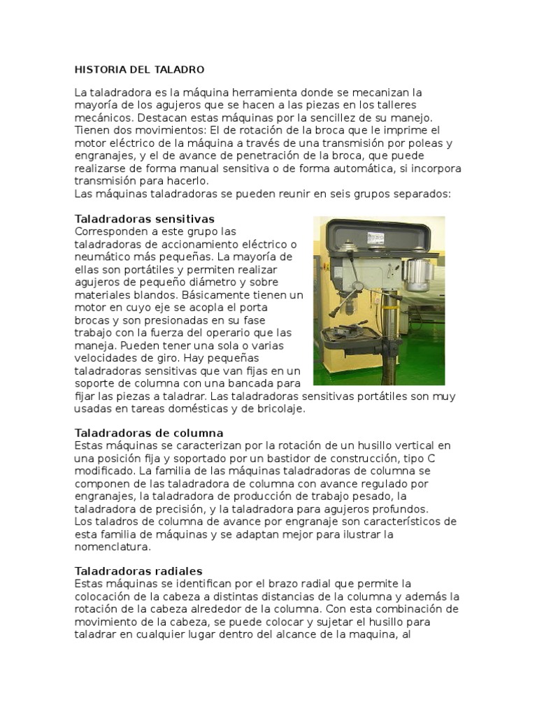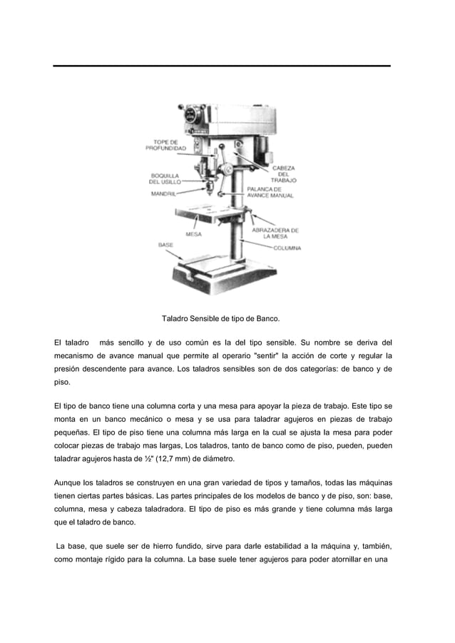 Taladro sensitivo de columna. Taladro de mano. Se denomina taladradora o taladro a la máquina o herramienta con la que se mecanizan la mayoría de los agujeros que se hacen a las piezas en los talleres mecánicos. Destacan estas máquinas por la sencillez de su manejo. Tienen dos movimientos: El de rotación de la broca que le imprime el motor eléctrico de la máquina a través de una.