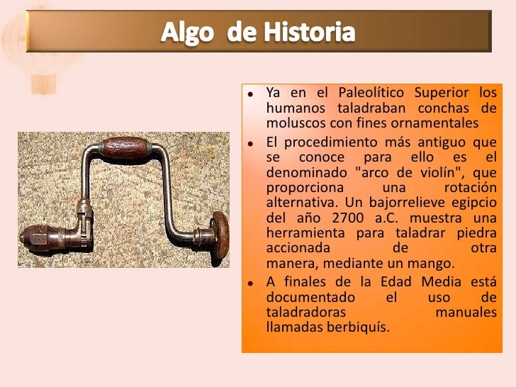 Los taladros han ido evolucionado conforme el paso del tiempo. Antiguamente para poder realizar perforaciones se utilizaron varios métodos como son. El Precursor de taladro el cual consiste en una varilla cilíndrica de madera que para poderla hacer que funcionara tienes que utilizar las manos. Otra manera muy antigua que se usó para poder.