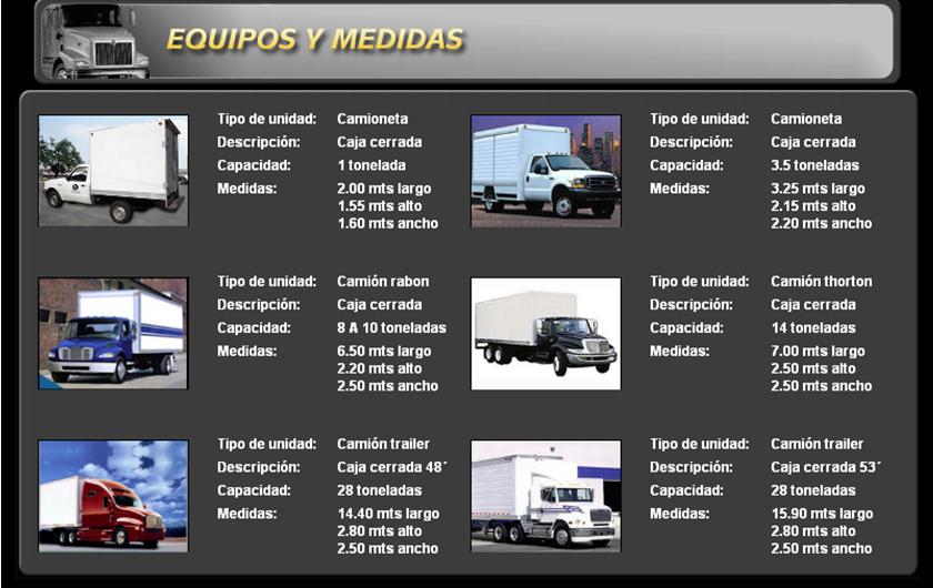 Rabon (1 eje) y Torton (2 ejes): en este tipo de camiones rígidos se realizan mudanzas, carga seca y paquetería. La capacidad es de 8 ton / Medidas: 6.50 x 2.50 x 2.40 m y 17 ton / Medidas: 6.50 x 2.50 x 2.40 m respectivamente. Caja cerrada: se traslada carga seca, el camión de 53 pies tiene capacidad hasta de 25 ton y sus medidas son: 15.90 x 2.50 x 2.50 m, el camión de 48 pies cuenta con.