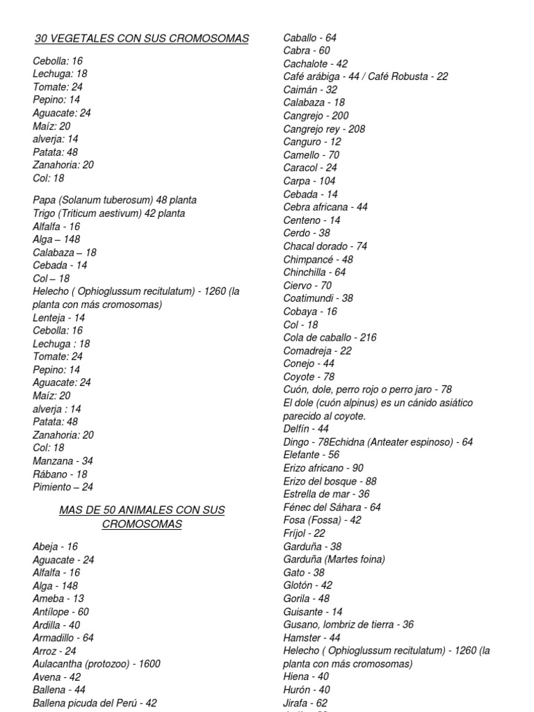 Un cromosoma es aquella estructura organizada que se encuentra formada por ADN y proteínas. Ejemplo de Animales y su número de cromosomas: Ratón: 40 Conejo: 44 Camello: 74 Llama: 74 Oso negro: 74 Jirafa: 62 Pavo: 80 Delfín: 44 Elefante: 56 Caracol: 24 Ejemplo de Vegetales y su número de cromosomas: Lechuga : 18 Tomate: 24. Pepino: 14. Aguacate: 24. Maíz: 20