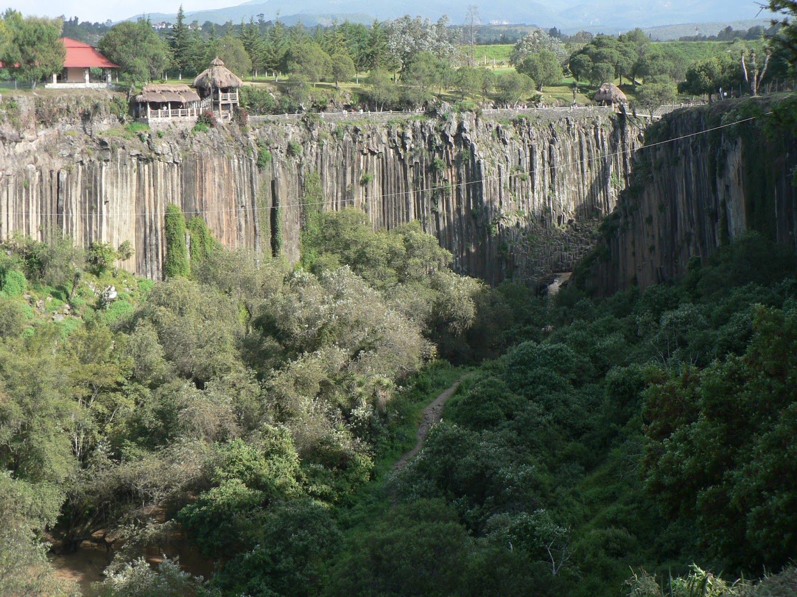 Panoramic view of Basaltic Prisms of Santa Maria Regla, Hidalgo, Mexico. Directions: From Mexico City, go to the city of Pachuca, 1.5 hr north by bus or car; from Pachuca, go to the town of Huasca de Ocampo, 30 minutes northeast by car; from Huasca de Ocampo, it is 10-minute car or taxi ride to the Hacienda Santa Maria Regla and the Basaltic.