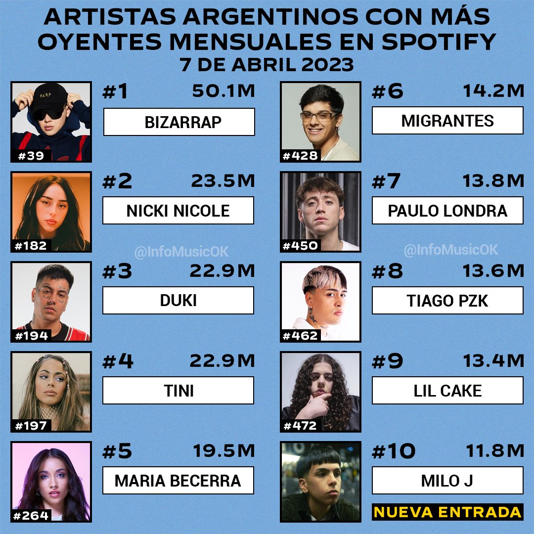 Info Music on Twitter "Milo J 🇦🇷 ingresa al TOP 10 Artistas Argentinos con más Oyentes